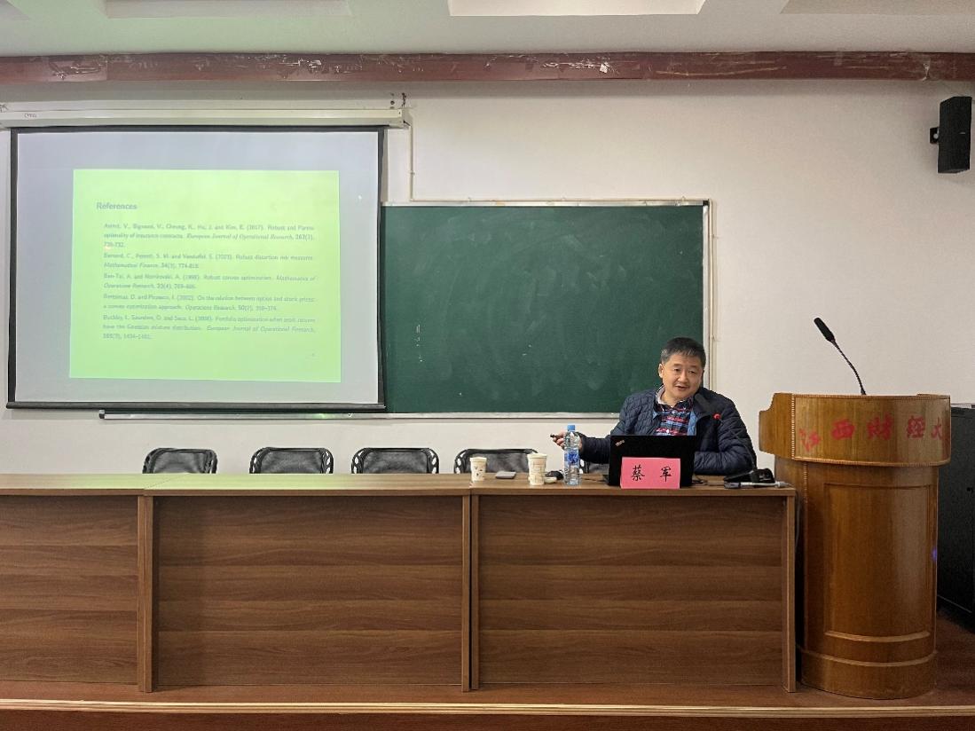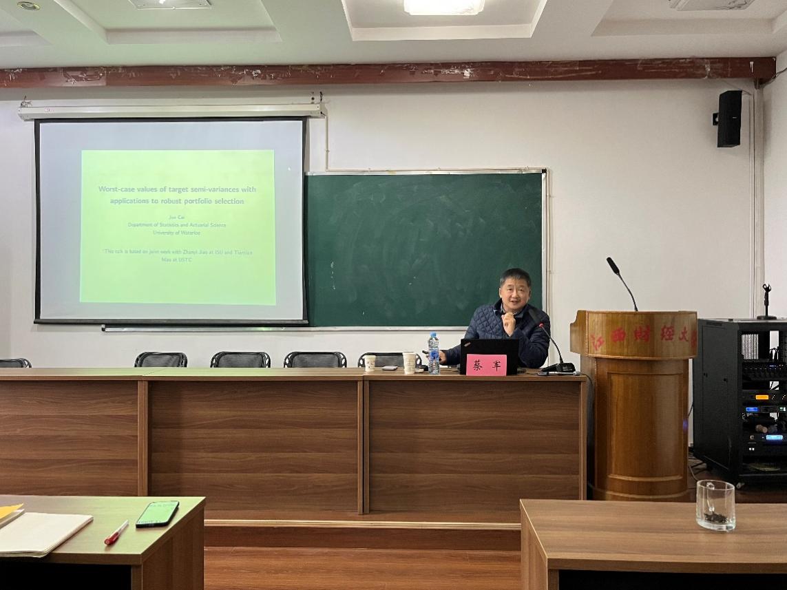 On the afternoon of November 18th, Professor Jin Cai from the Department of Statistics and Actuarial Science at the University of Waterloo, Canada, delivered a lecture entitled "Worst-Case Values of Target Semi-Variances with Applications to Robust Portfolio Selection" at Room 414, North District Integrated Building. The lecture was hosted by Vice President Zhang Hua, and some faculty and students from the School of Statistics and Data Science attended the event.