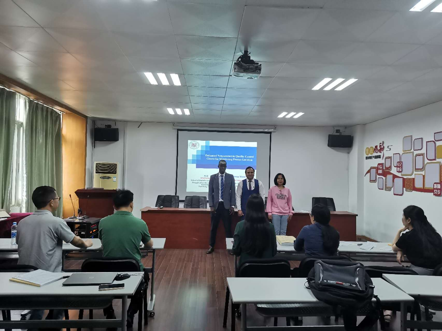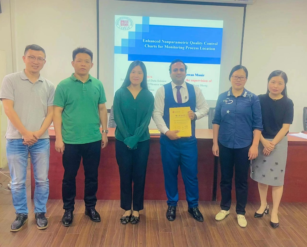 Before the thesis defense began, Mr. Liu Yuzi introduced the procedure, rules and other requirements of our overseas doctoral graduation defense. At the beginning of the defense, students went on stage in turn to make a comprehensive presentation on the background and significance of the dissertation topic, the current status of research at home and abroad, the content of the research, the research methodology and the work plan. Rizwan Munir, an overseas PhD student of the class of 2020, discussed the use of improved non-parametric statistical quality control charts in the monitoring process. Twahil Hemed Shakiru, an overseas PhD student of the class of 2021, presented his dissertation on statistical modeling and analysis of carbon dioxide emissions in East Africa. Khin Sandi Myint, an overseas PhD student of the class of 2021, used supervised learning methods to study domestic violence in Myanmar. The professors asked questions, affirmed or challenged the issues in the students' presentations, suggested modifications, and finally graded them according to the specific assessment indicators of the Overseas Doctoral Graduation Defense Grading Criteria.